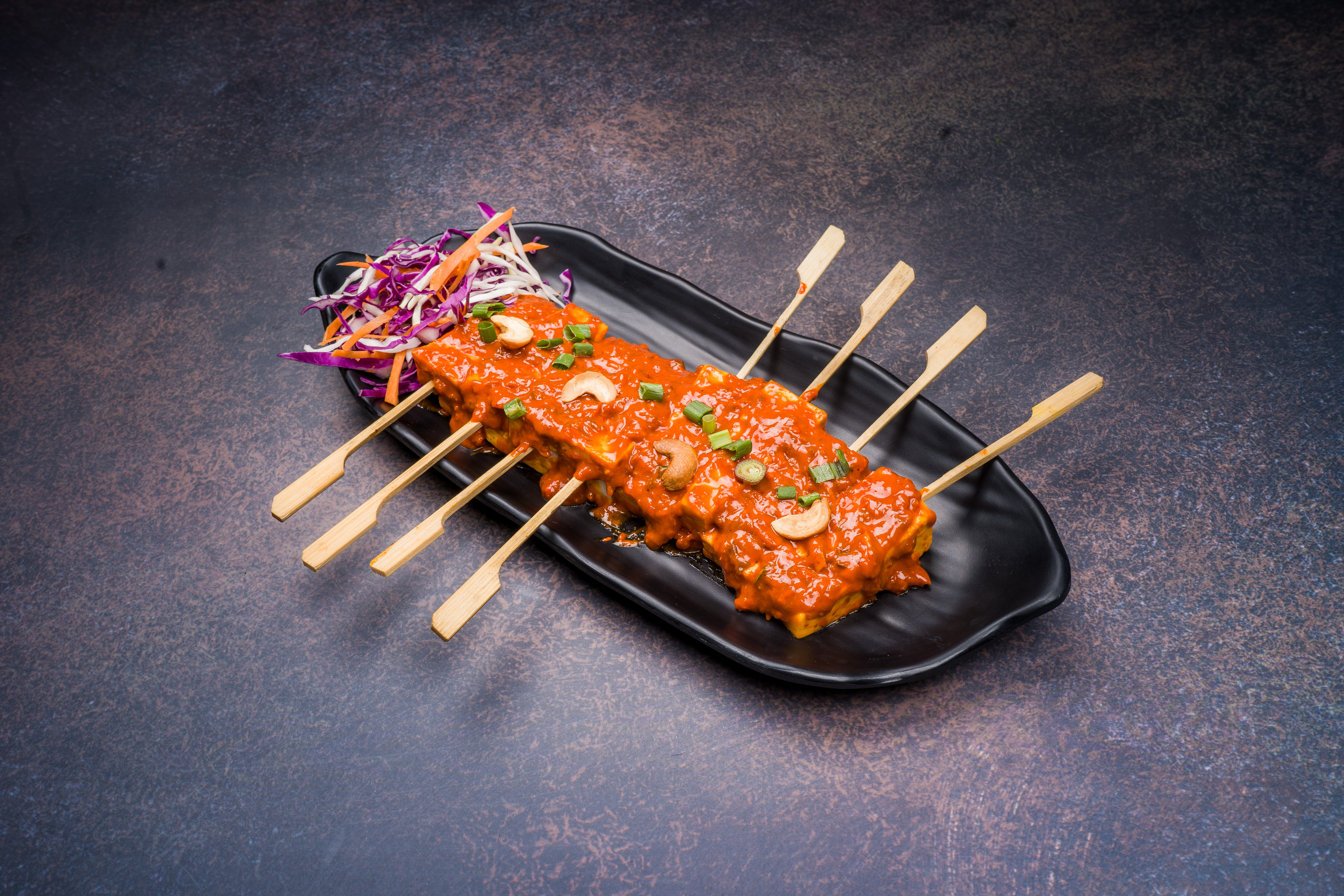 [8 pcs,1-2 Serves] Grilled Indian cheese on sticks, marinated in spices, served with peanut sauce.
